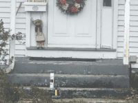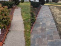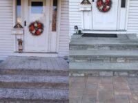 This customer has a damaged, faded and out of date concrete staircase. They also had an old concrete walkway which we replaced with a paver entranceway. We had to remove the existing concrete sidewalk, excavate a base, install base stone and finally install modern paving stones. We veneered the old concrete staircase with Thermal Bluestone and natural stone.
